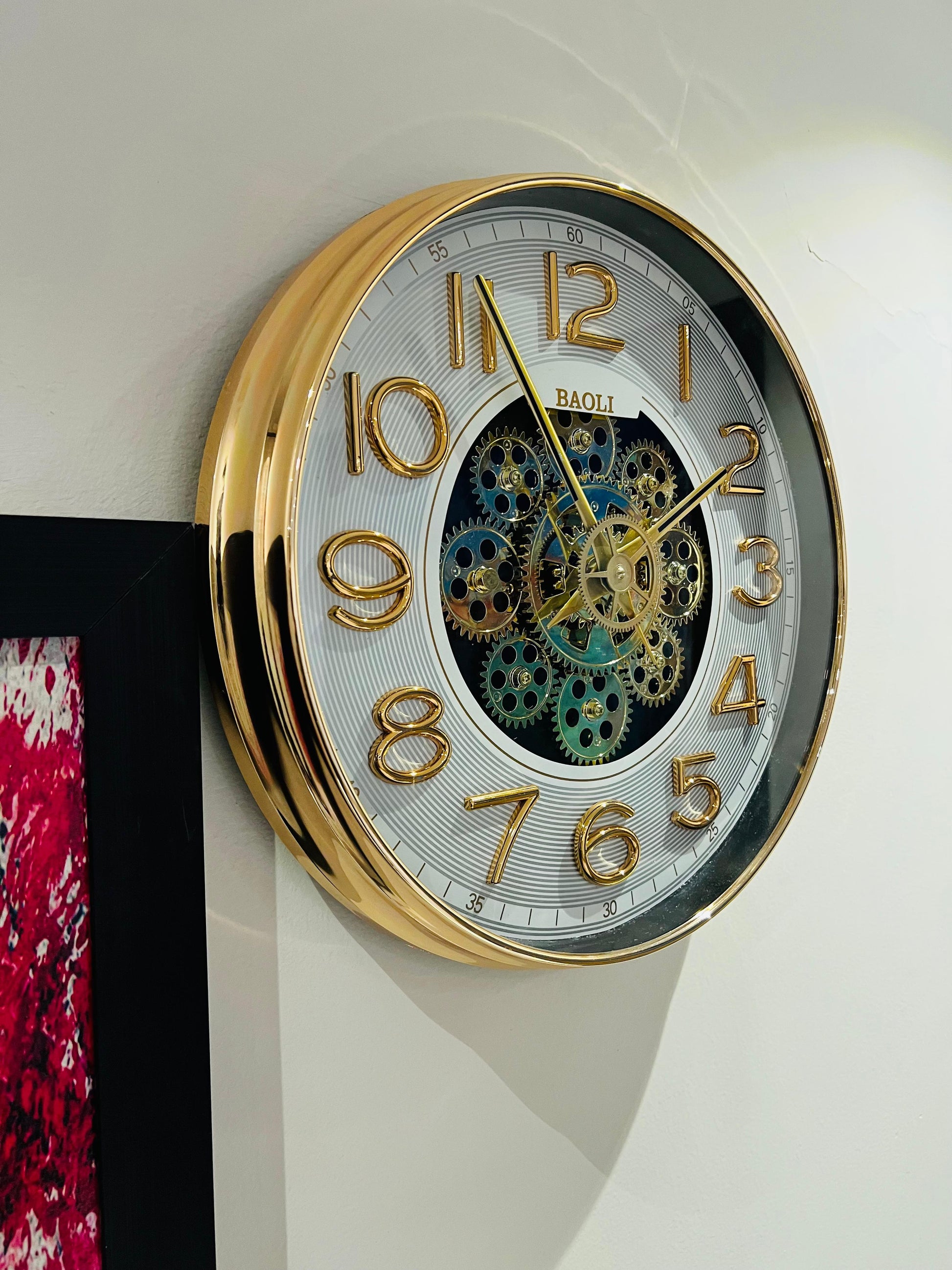 Make a powerful style statement with the Baoli 3D Gold Gear Wall Clock, featuring elegant Roman numerals, visible golden gears, and a detailed 3D frame. Perfect for adding depth and sophistication to your space. Whether you're decorating a modern home or a stylish office, this clock is both functional and eye-catching. Best-selling gear wall clock online in Pakistan.