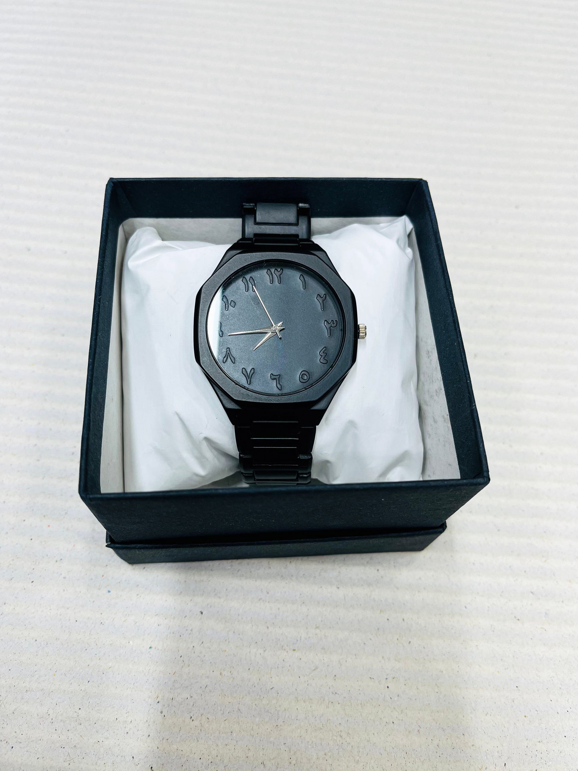 Stand out with this Arabic Numerals Black Dial Watch. Featuring a bold matte-black finish and unique engraved Arabic numeral dial, this piece is perfect for those who prefer a modern, statement-making design. Powered by quartz movement and paired with a durable stainless steel strap, it’s both stylish and practical.