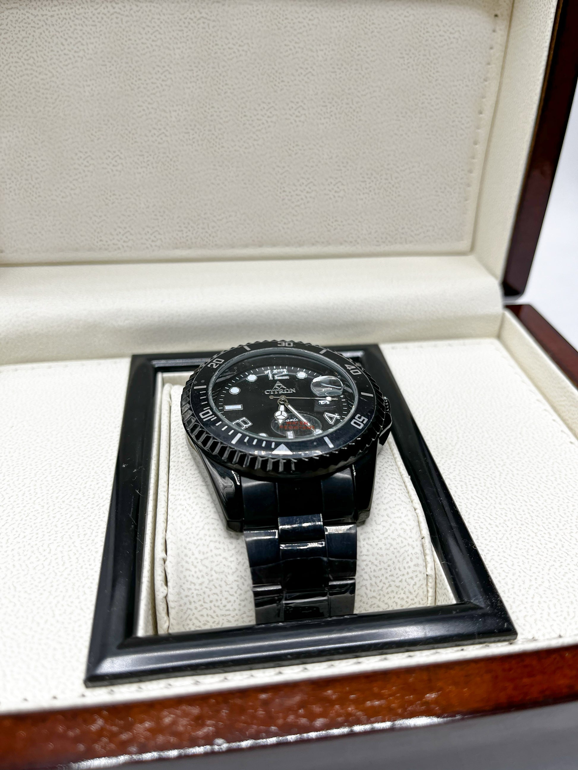 Make a bold statement with the Citron Black Diver Men’s Luxury Quartz Watch, crafted for men who value precision and power. With a durable stainless steel band, luminous hands, and a rotating bezel, this timepiece blends functionality with premium design — perfect for daily wear or professional attire.
