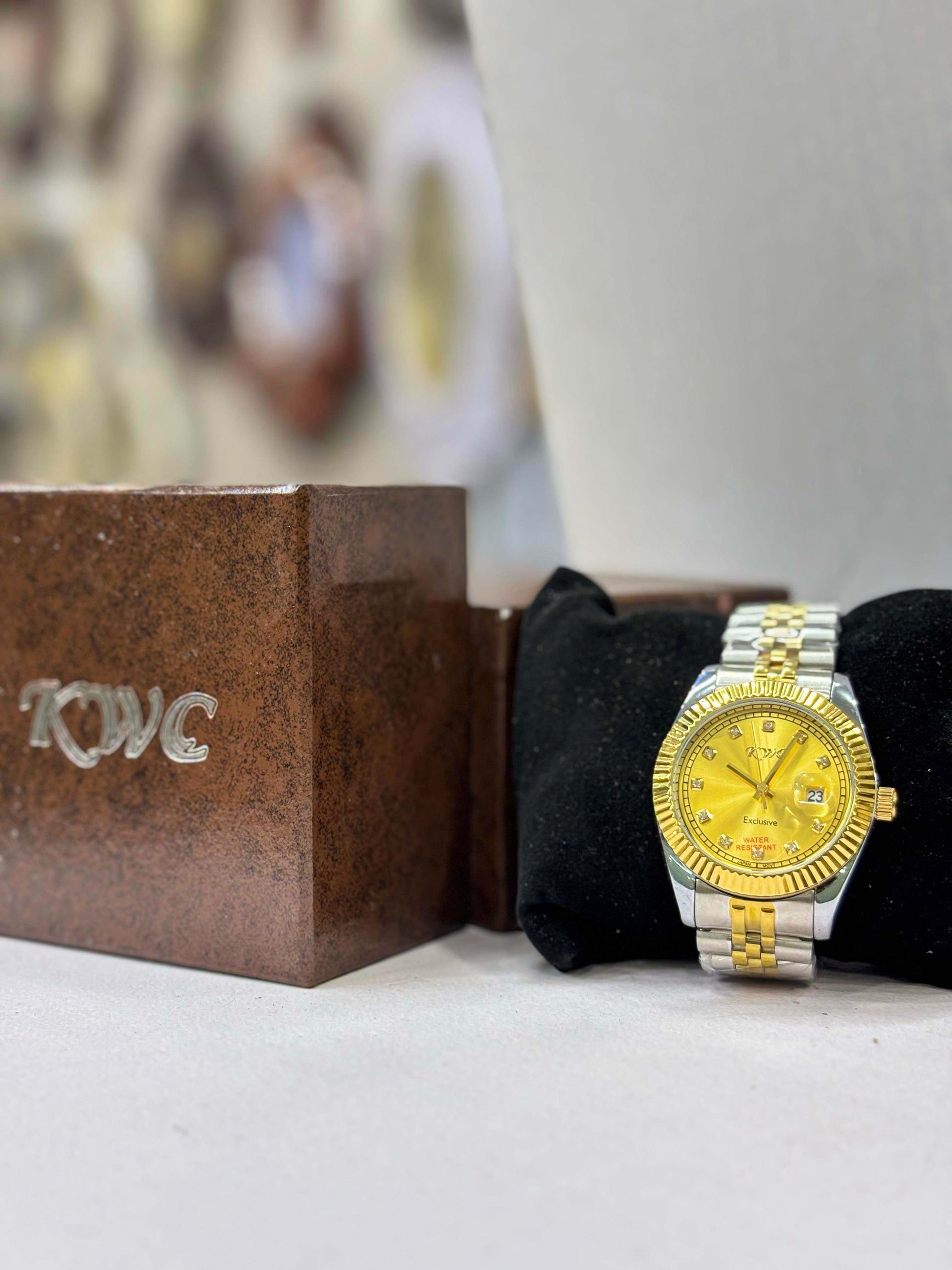 This KWC Exclusive Watch is built for those who value style, precision, and bold presence. Featuring a stunning gold sunburst dial, shining diamond-like markers, and a durable dual-tone stainless steel strap, this timepiece gives your outfit the premium finish it deserves.