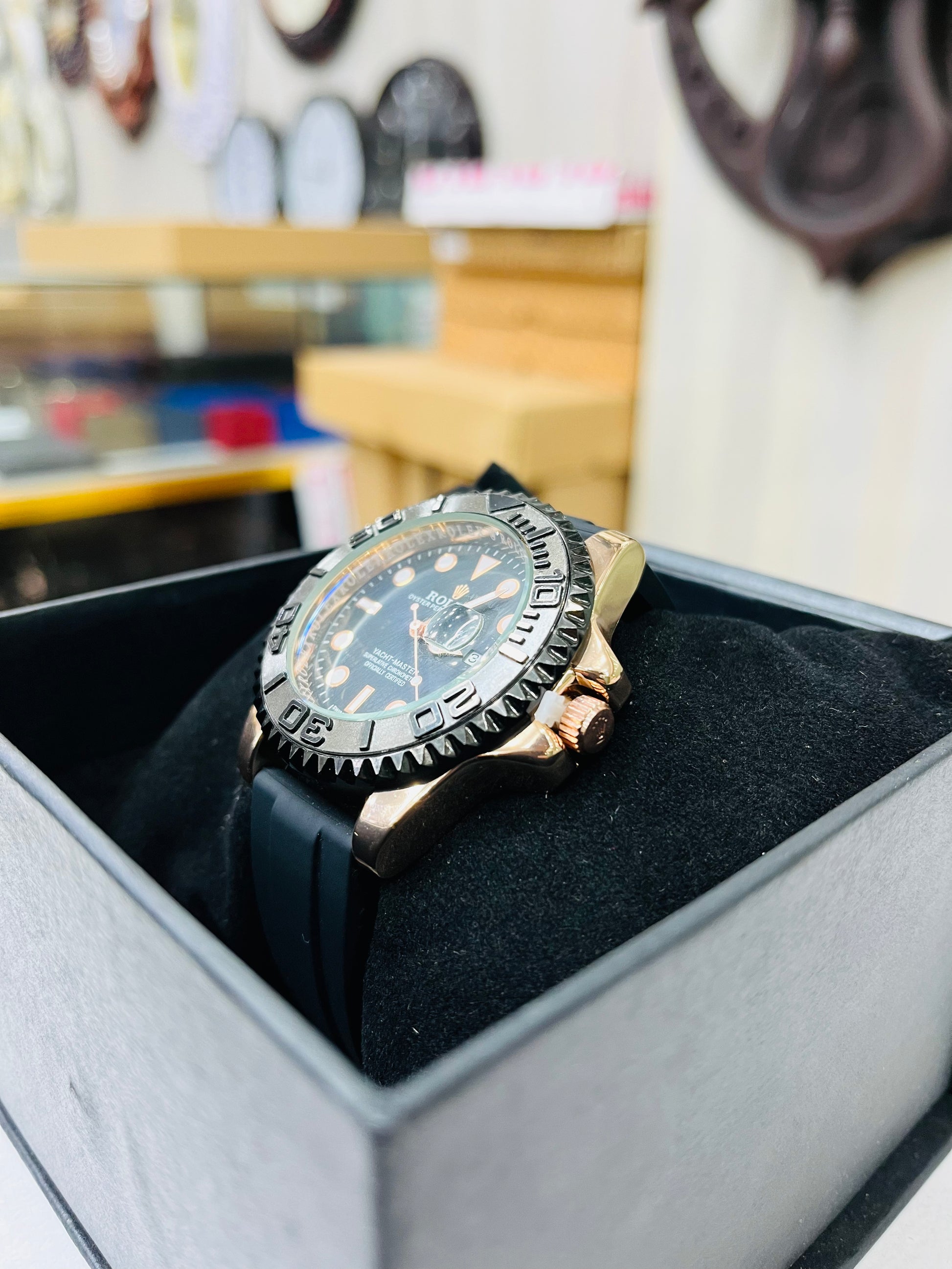 Upgrade your style with this luxury black dial sports watch, designed for men who value both elegance and performance. Featuring a bold bezel, luminous hands, and a durable rubber strap, this wristwatch is perfect for everyday wear, business meetings, or casual outings. Its classic design adds a touch of sophistication, while the water-resistant build ensures reliability.
