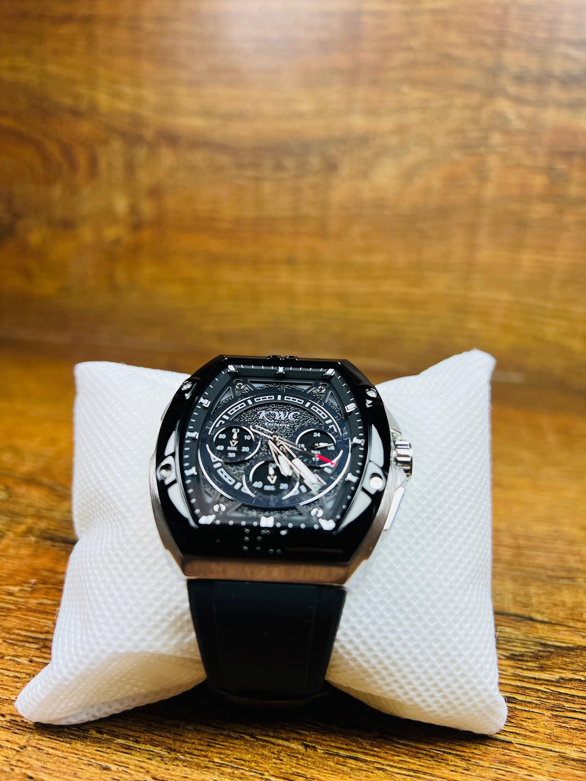 Discover timeless sophistication with our Luxury Men’s Chronograph Watch, expertly crafted for the modern gentleman. With a striking black dial, durable rubber strap, and bold hexagonal case design, this watch combines elegance, performance, and attitude — perfect for both everyday wear and formal occasions.