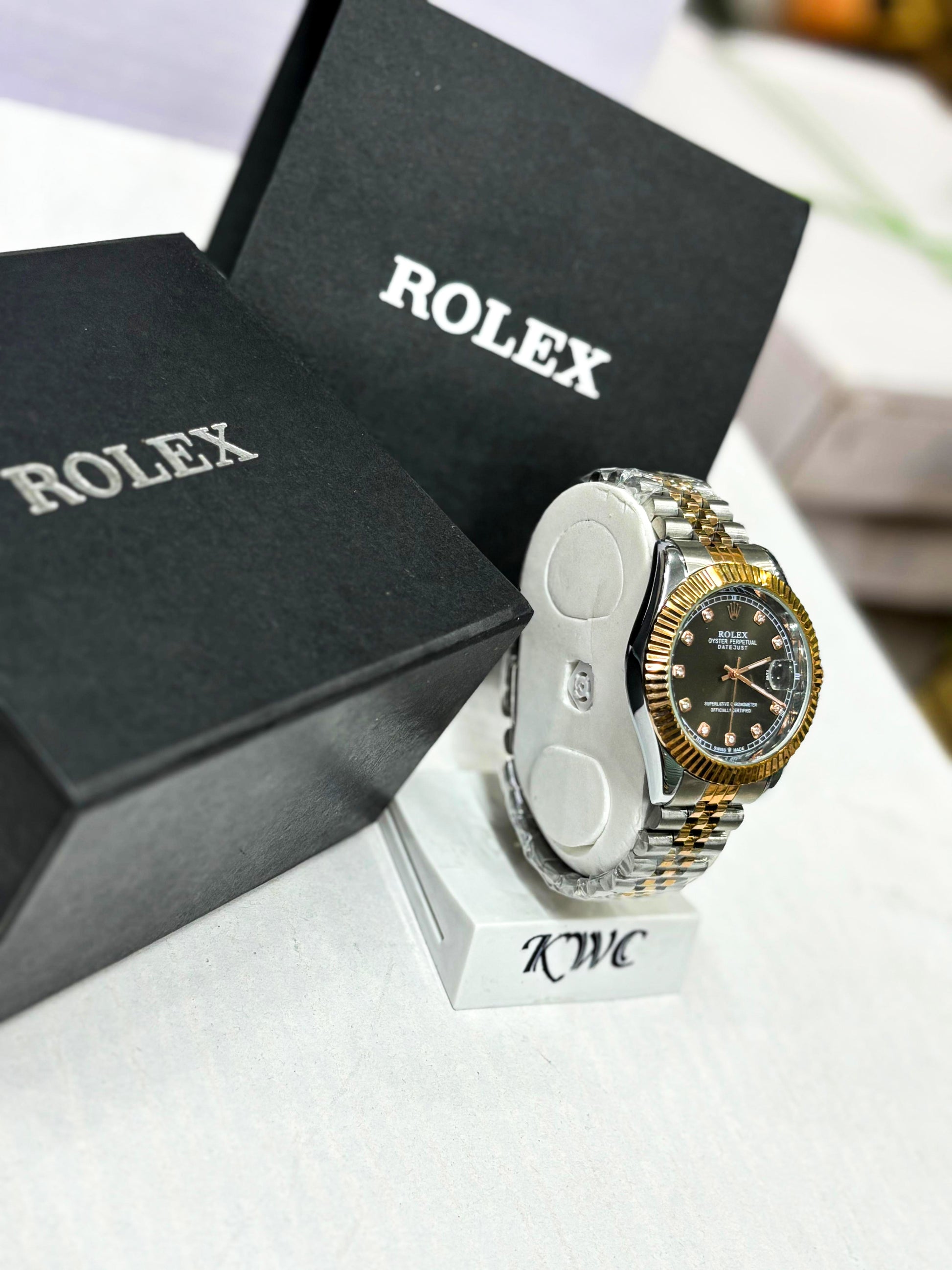 Turn heads with this luxury Rolex-inspired dual-tone men’s watch. Featuring a silver and gold stainless steel strap with a textured bezel, this timepiece radiates elegance and status. The diamond-style hour markers on the dark dial add a refined sparkle, while the date magnifier window provides easy calendar visibility.